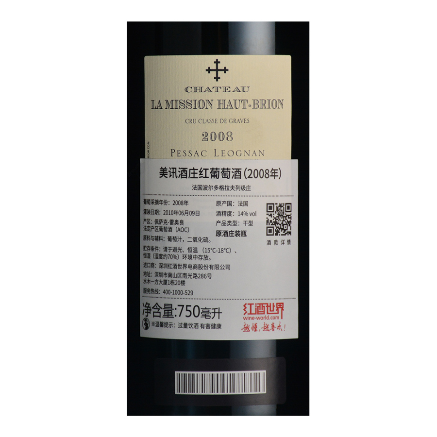 美讯酒庄坐落于格拉夫的佩萨克-雷奥良产区,如今由克兰斯帝龙酒业(Domaine Clarence Dillon)掌管。酒庄出品的葡萄酒品质优异,获得了众多葡萄酒专业人士的好评。帕克曾说:“在我的个人收藏中,我所拥有的美讯佳酿,比世界上任何一款酒都多。长期以来,美讯都是最顶尖的佳酿之一,亦是品质最稳定的佳酿之一。”2008年份的此酒选用赤霞珠、梅洛和品丽珠混酿,酒液呈紫红色,散发出蓝莓、黑色覆盆子、甘草、松露和森林地表的香气,并缀以烟熏、烟草和石头的气息。其口感清新,酸度充沛,酒体饱满,单宁如天鹅绒般丝滑,平衡感良好,余味美妙悠长。