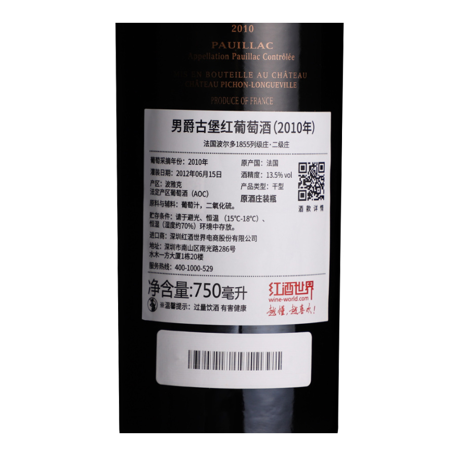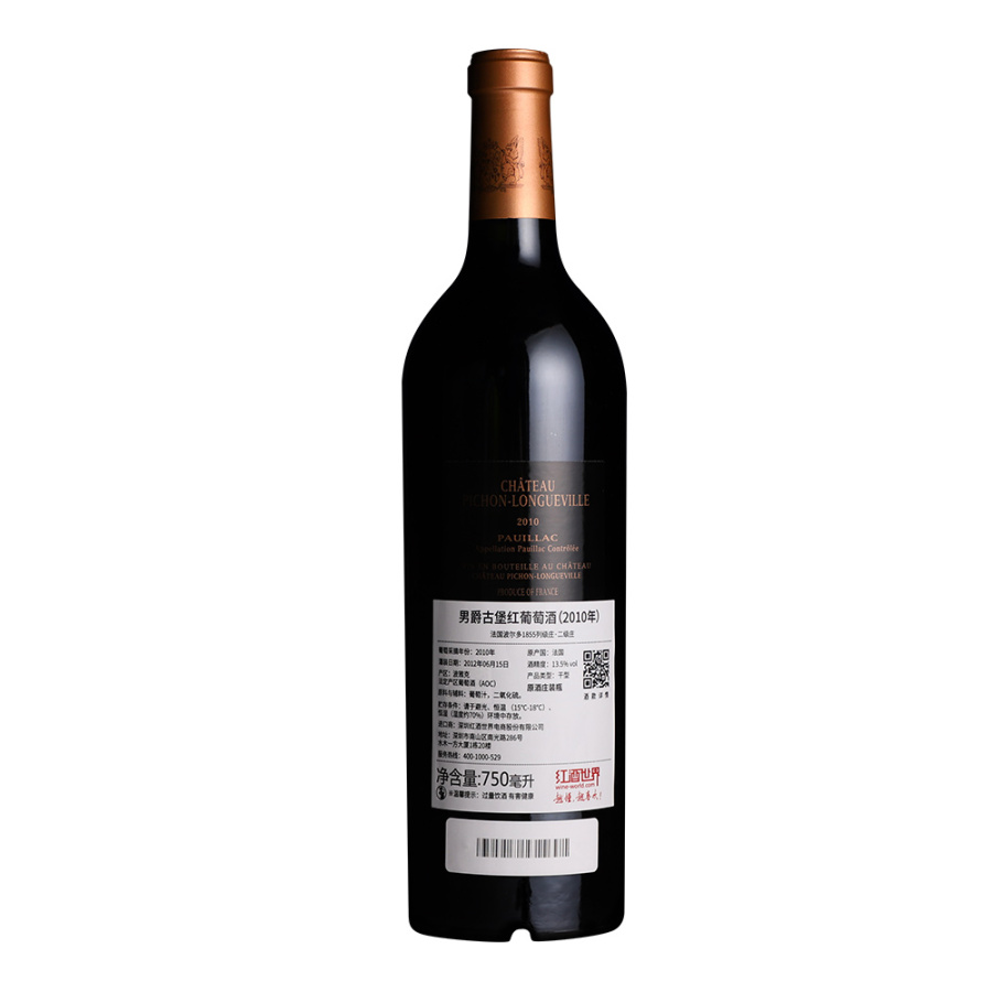 这款红葡萄酒1855二级庄男爵古堡的正牌酒,酿酒葡萄来自庄园历史悠久的地块上种植的最古老的葡萄树。这款正宗的波雅克葡萄酒以其黑色水果的味道和香料的气息提供了令人惊叹的感官体验,表现出优雅、强烈且独特的口感。2010年的此酒酒液呈浓郁的紫红色,散发着新鲜的红色和黑色水果的香气,随后是温和的香料、薄荷和可可的味道,口感强劲而富有爆发力,单宁强烈而精致,酒体饱满,余味悠长而活泼。这款佳酿具有极好的陈年潜力。
