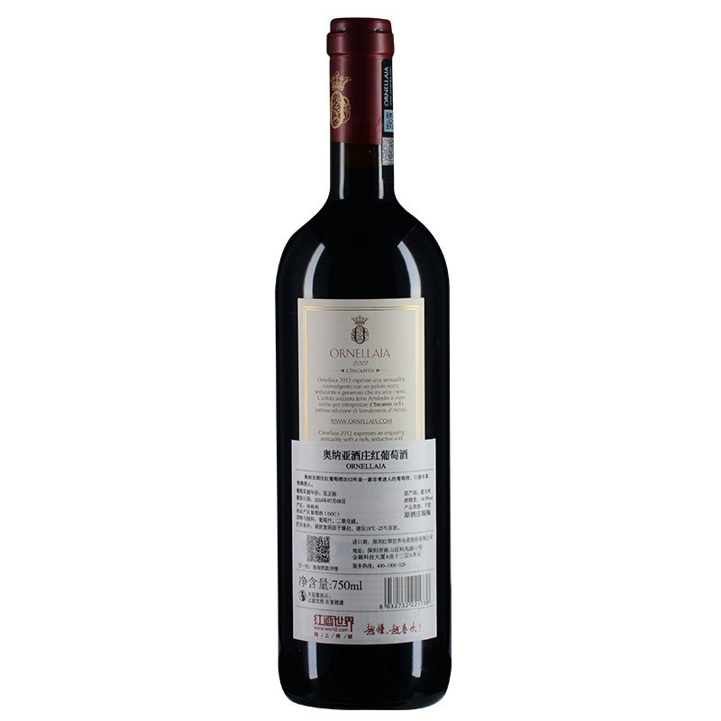 这是一款来自意大利托斯卡纳产区的红葡萄酒, 由精选的赤霞珠、梅洛、 品丽珠和味而多混酿而成。2012年份气候比较炎热,葡萄采摘期比往常提前了两周,因而葡萄的果实愈加成熟醇美。酒款经传统工艺酿造,限量生产,不断获得全球权威专家的高值评分和首肯。这款酒带有微妙的黑樱桃风味,并伴有香料、皮革的味道,尾调中则透着淡淡的烟草味。单宁似刀锋,尖锐而泼辣,平添了几分趣味。酒的浓度和密度都恰到好处,果味浓郁而不失优雅,口感绵柔而不失分量。酒庄邀请瑞士美术大师约翰·阿姆雷德(John Armleder)为2012年份酒款设计了酒标“飞溅”(Splash),灵感来自于这款酒给他带来的惊喜和愉悦,犹如飞溅的酒液一样向四面八方散播。艺术作品与葡萄酒相遇,视觉美感与味觉结合,这便是2012年份奥纳亚酒庄红葡萄酒的独特之处。值得一提的是,一箱6瓶装的木箱中仅有1瓶上印有“飞溅”酒标。