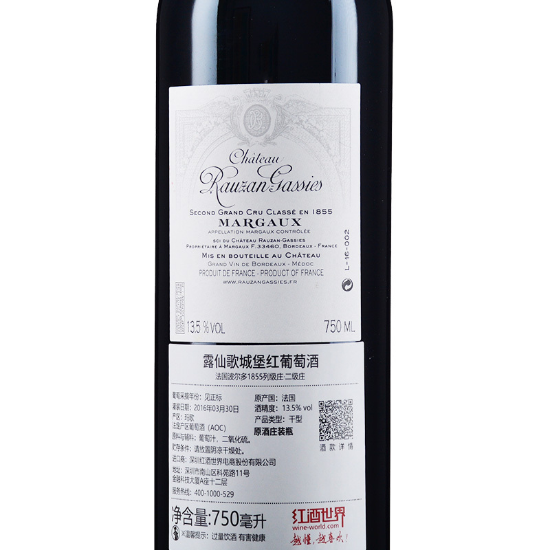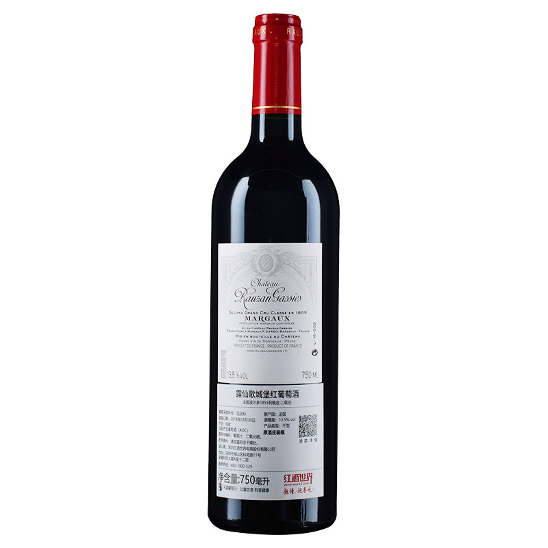 这是一款来自法国波尔多(Bordeaux)产区玛歌村(Margaux)的红葡萄酒。这款酒是1855二级庄(Second Growth)——露仙歌城堡(Chateau Rauzan-Gassies)的正牌酒。露仙歌城堡是法国贵族的代表,百年来沉淀出的经典雍容气质,让露仙歌的美酒不仅保持了一贯的卓越品质,也逐渐蕴含了贵族的神韵。露仙歌酒庄的正牌酒,酒体厚重丰满,浓郁强劲。在大多数年份里,露仙歌酒庄的酒成熟速度十分惊人,通常只需10年的时间就能达到巅峰。在较好的年份里,露仙歌酒庄的葡萄酒陈年的时间甚至可以超过半个世纪的时间。这款2014年份佳酿风味动人,带有迷人的紫罗兰、醋栗和李子的味道,风味鲜明,单宁丰富顺滑,余味悠长。