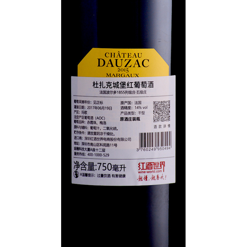 2015年杜扎克城堡红葡萄酒 (法国1855五级庄 不同进口批次因酒庄装瓶时间不同,酒款背标的灌装日期有所差异,随机发货)