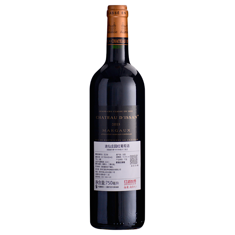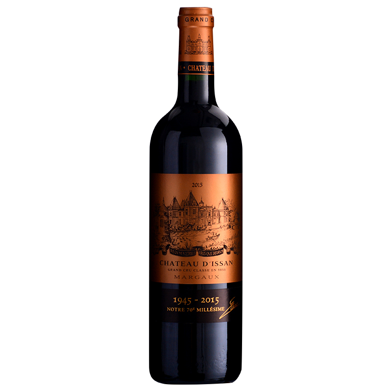这是一款来自法国波尔多产区玛歌村(Margaux)的红葡萄酒,产自1855三级庄——迪仙庄园(Chateau D'Issan)。酒庄出产的葡萄酒很早之前就备受欧洲王室的青睐,经常被选作皇家宴会等重要场合的专用酒。19世纪末,奥地利国王朗茨-约瑟夫(Franz-Joseph)曾说过,迪仙庄园的葡萄酒是“国王之贡品,神坛之祭品”。2015年迪仙庄园红葡萄酒香气浓郁,紫罗兰、玫瑰、樱桃以及香料等气息层层交织,酒体饱满,单宁圆润,口感醇厚,架构均衡,余味悠长,优雅的风格中不失力量感。
