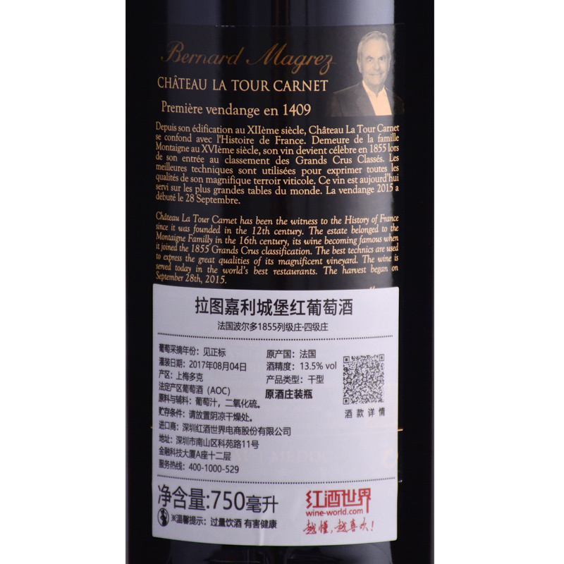 这是一款来自法国波尔多产区的红葡萄酒,是上梅多克(Haut-Medoc)古老酒庄——拉图嘉利城堡(Chateau La Tour Carnet)的正牌酒。拉图嘉利城堡的起源可追溯至中世纪,1855年晋升为上梅多克的“四级庄”。近年来,拉图嘉利正牌酒曾有多个年份获得由罗伯特·帕克(Robert Parker)主办的杂志《葡萄酒倡导家》(Wine Advocate)90分以上的高分评价。2015年份的此款葡萄酒酒体纯净,香气清新,鼻尖萦绕着蓝莓的香气,夹杂着淡淡的香料和蘑菇气味。酒体饱满,口感雅致,给人以精致和圆润感。