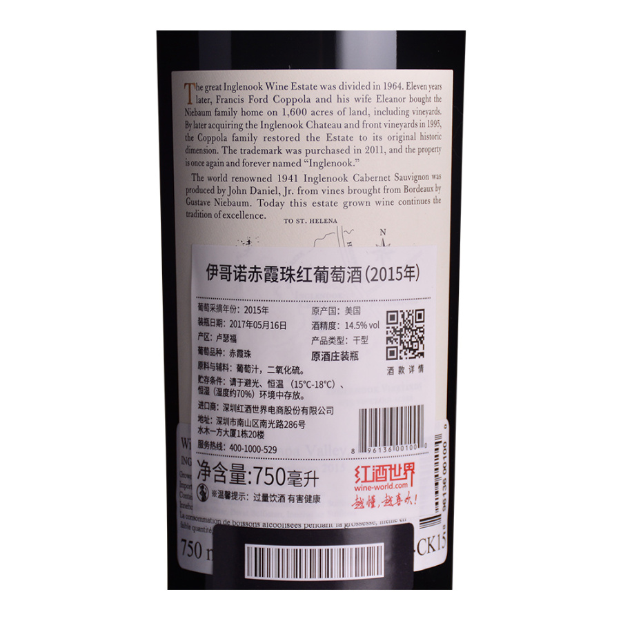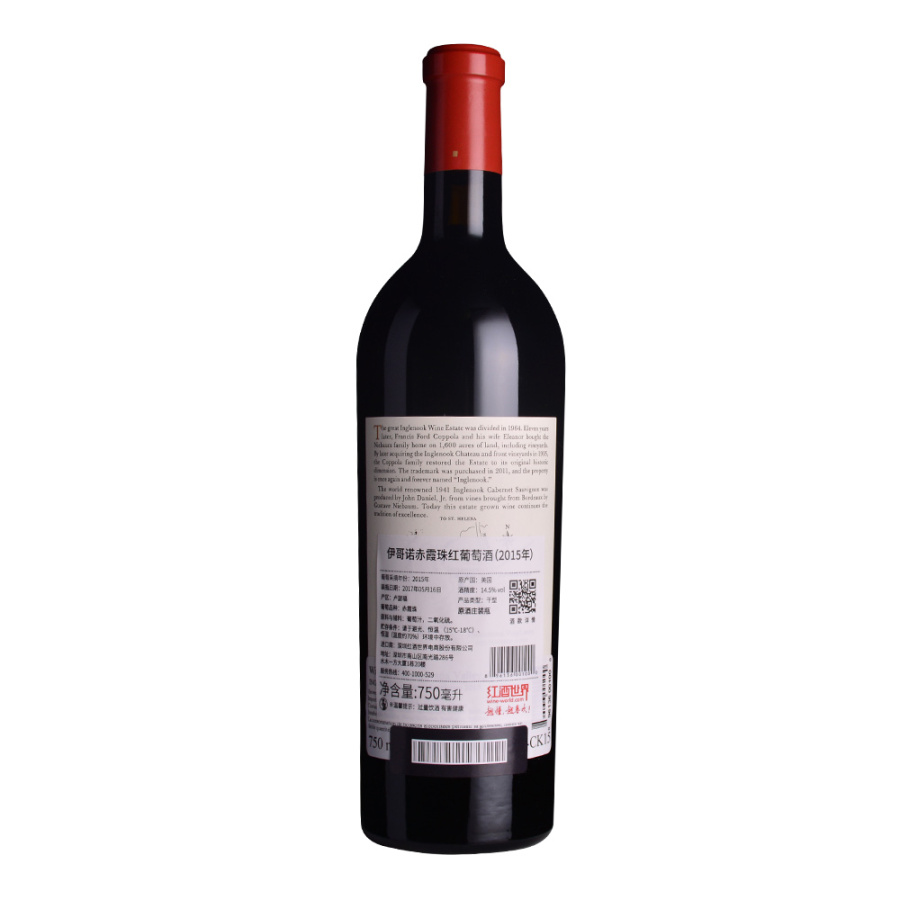 此款葡萄酒产自美国纳帕谷产区,由该产区的知名酒庄——伊哥诺酒庄( Inglenook)出品。伊哥诺赤霞珠红葡萄酒的诞生是为了向小约翰·丹尼尔(John Daniel, Jr.)致敬,其采用古斯塔夫·尼鲍姆(Gustave Niebaum)从波尔多引进的优质葡萄酿制了备受瞩目的1941年伊哥诺赤霞珠葡萄酒。2015年伊哥诺赤霞珠红葡萄酒是伊哥诺酒庄风土人情的经典表现,散发出黑醋栗、黑樱桃、香草和八角茴香的复杂香气,柔顺、成熟的单宁增强了天鹅绒般顺滑的口感,富有深度,余味中富含黑色水果风味。