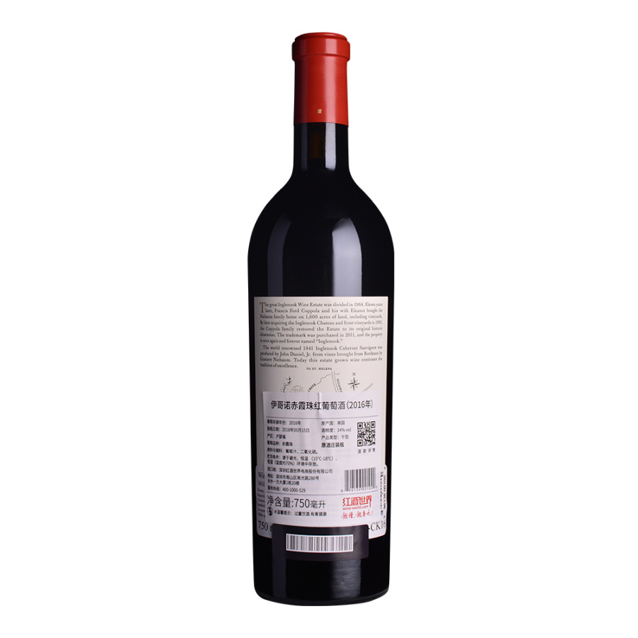 此款葡萄酒产自美国纳帕谷产区,由该产区的知名酒庄——伊哥诺酒庄( Inglenook)出品。伊哥诺赤霞珠红葡萄酒的诞生是为了向小约翰·丹尼尔(John Daniel, Jr.)致敬,其采用古斯塔夫·尼鲍姆(Gustave Niebaum)从波尔多引进的优质葡萄酿制了备受瞩目的1941年伊哥诺赤霞珠葡萄酒。2016年伊哥诺赤霞珠红葡萄酒香气馥郁,散发出成熟的黑樱桃和黑莓的香气,并伴有薰衣草、百里香和月桂的气息。其口感平衡,单宁细腻,与橡木带来的风味完美融合,余味芳香而持久。
