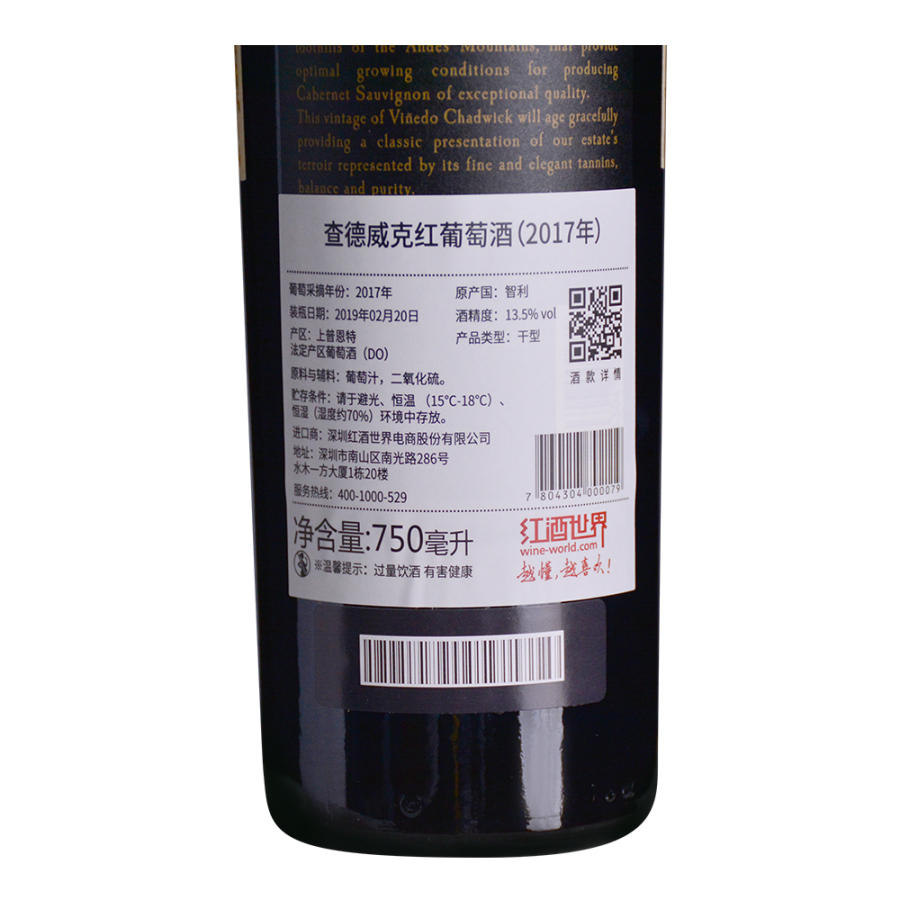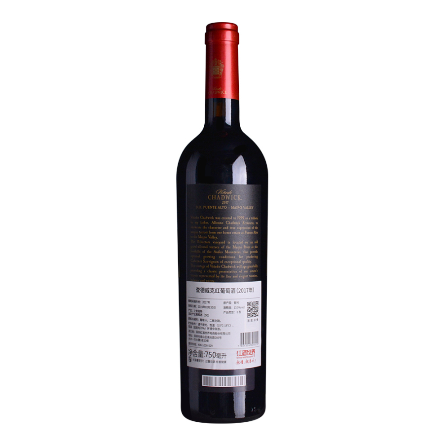 查德威克酒庄的第一个年份酒(1999年)于2002年推出,取得了巨大成功。其第二个年份(2000年)在2004年1月23日的柏林品鉴会上创造了历史。自第一个年份以来,查德威克酒庄一直备受赞扬和追捧,连续五年被罗伯特-帕克(Robert Parker)评为智利赤霞珠得分最高的酒庄。2017年查德威克红葡萄酒果味纯净,芳香诱人,酒体饱满,单宁丝滑,成熟的水果风味和香醇的酸度相平衡,余味精致细腻。