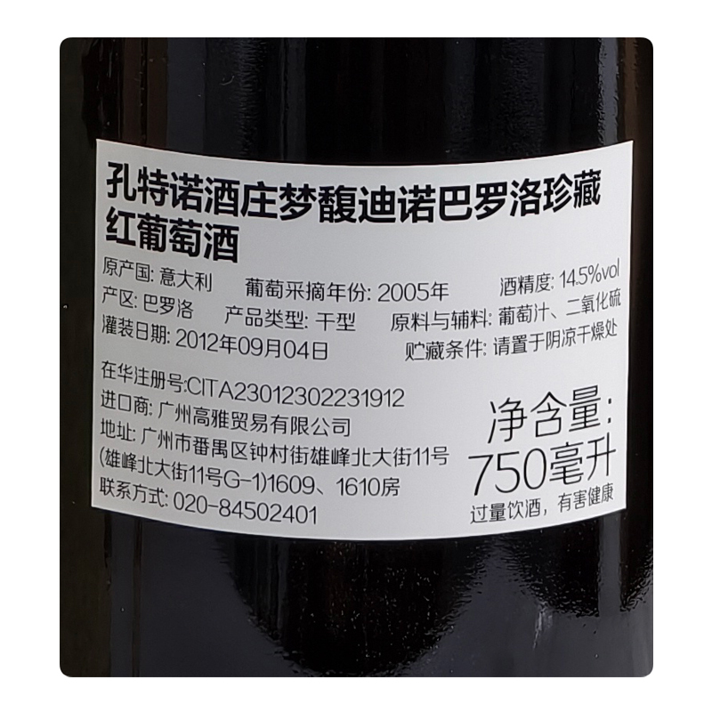 2005年孔特诺酒庄梦馥迪诺巴罗洛珍藏红葡萄酒