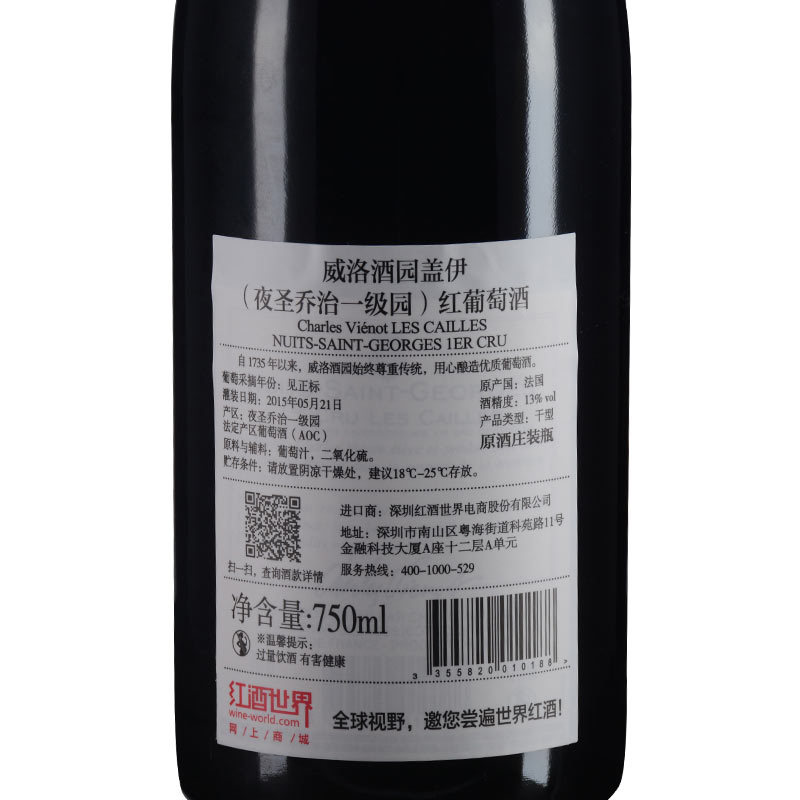 这款红葡萄酒由法国勃艮第产区的知名酒庄威洛酒园出产。该酒庄历史悠久,十分重视传统,坚持采用勃艮第产区古老的酿酒工艺。这款酒的酿酒葡萄来自夜圣乔治村(Nuits-Saint-Georges)的一级园——盖伊(Les Cailles)。2007年的此酒散发着樱桃、覆盆子等红色水果的香气,伴有香料的气息,其口感强劲,单宁充沛,余味悠长。