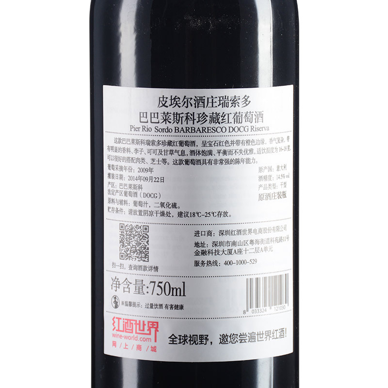 2009年皮埃尔酒庄瑞索多巴巴莱斯科珍藏红葡萄酒 (巴巴莱斯科DOCG)