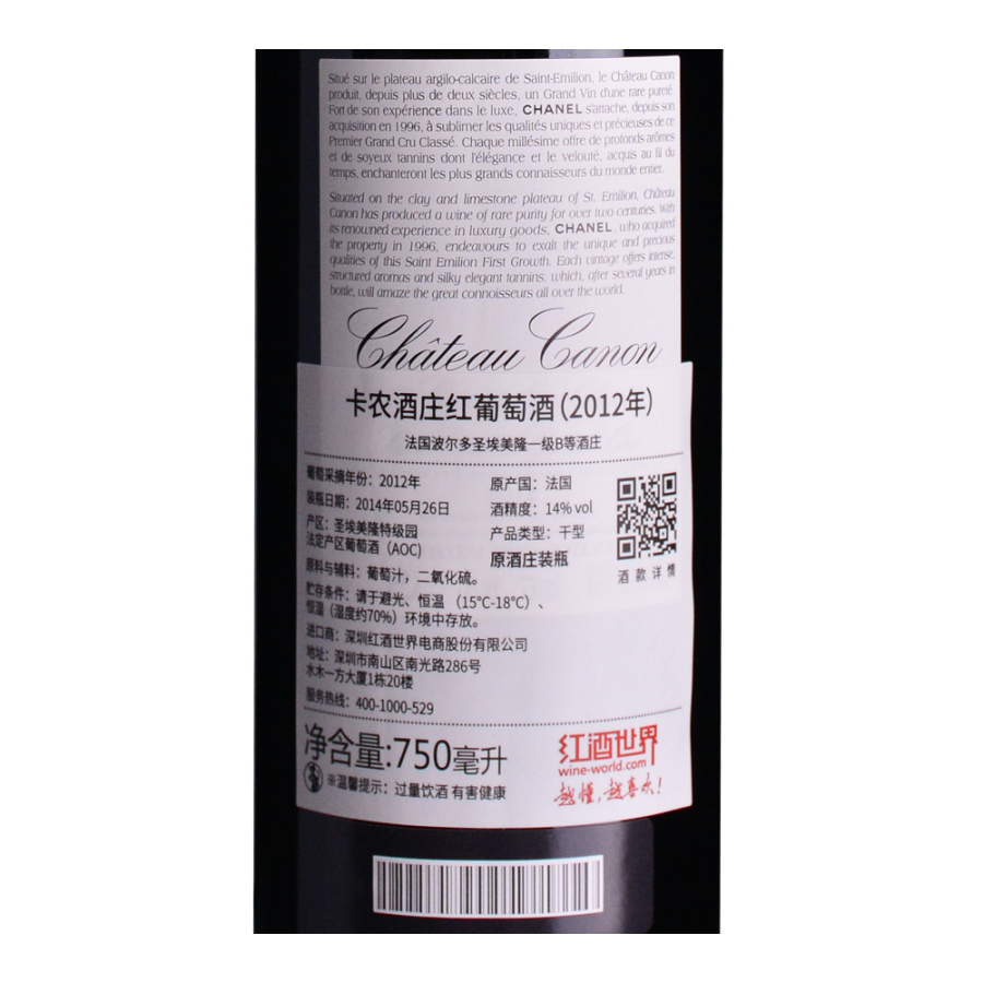 2012年卡农酒庄红葡萄酒 (法国圣埃美隆一级B等酒庄)