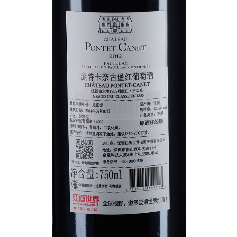 2012年庞特卡奈古堡红葡萄酒 (法国1855五级庄)