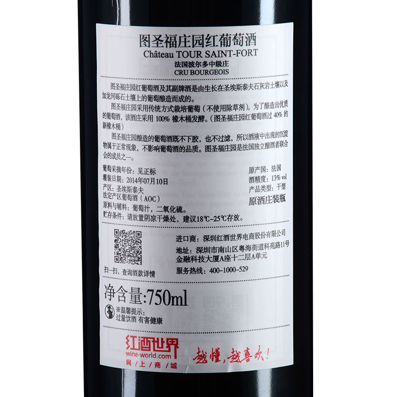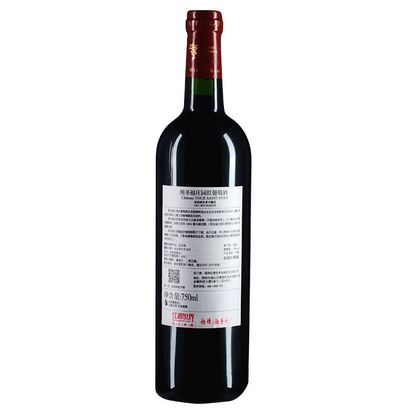 这是一款来自法国波尔多的红葡萄酒,是波尔多中级庄图圣福庄园的正牌酒。该酒庄的正牌酒在发酵完成后会置入40%比例的新法国橡木桶中熟成18个月,酿造完成的葡萄酒既不经过下胶,也不经过过滤,所以酒液中出现沉淀物属于正常现象,并不影响葡萄酒的品质。