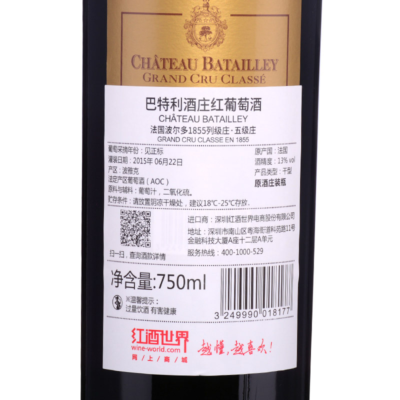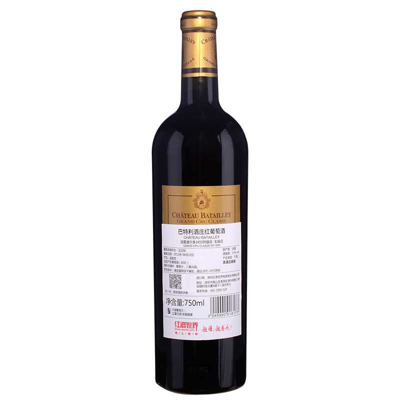 这是一款来自法国波尔多波雅克村的红葡萄酒。这款酒是波雅克五级庄——巴特利酒庄的正牌酒。巴特利酒庄是波雅克古老的酒庄之一,据说其名字来源于英法百年战争时期,跟同为五级庄的奥巴特利酒庄(Chateau Haut-Batailley)同出一源。酒庄葡萄园中葡萄藤的平均树龄为35年,葡萄成熟后,会采用人工方式进行采摘,去梗破皮后,置入控温的不锈钢桶中发酵,之后转入橡木桶中陈酿20个月,装瓶前会进行轻微的过滤。酒庄在优秀年份能够很好地表现出波雅克的风土特色,其结构坚实,色泽深邃,散发着淡淡的浆果及香草香气,陈年潜力不俗。