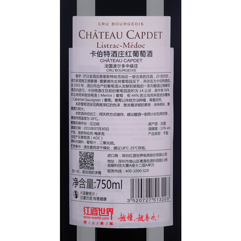 这是一款来自法国圣朱利安产区的红葡萄酒。卡伯特酒庄原来是圣朱利安产区内一座古老的庄园,20世纪初时改建为卡伯特酒庄。酒庄以传统的方法种植葡萄,尊重自然。2013年份的这款葡萄酒呈现出经典的深红色,散发着浓郁的果香,红醋栗、覆盆子等红色浆果的风味十分浓郁,且余味悠长,窖藏潜力较大。