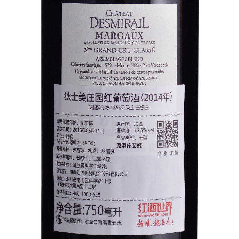 这是一款来自法国波尔多产区玛歌村(Margaux)的红葡萄酒,是玛歌产区的三级庄(Third Growth)——狄士美庄园( Chateau Desmirail)的正牌酒。此款酒呈深红色,散发着新鲜的红色浆果和西洋李子的香气,风味中带有花香的味道,单宁质地良好,富有活力,酸度较高,陈年潜力优秀,此酒将在2018年达到适饮期,之后10多年里都将会有不错的表现。