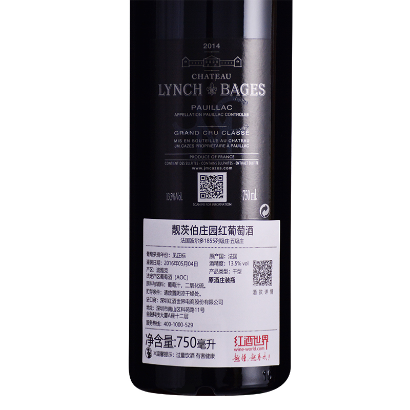 这是一款来自法国波尔多(Bordeaux)产区波雅克村(Pauillac)的红葡萄酒,是1855五级庄(Fifth Growth)——靓茨伯酒庄(Chateau Lynch-Bages)的正牌酒。早在20世纪90年代,靓茨伯葡萄酒就已经达到了“超二级庄”的水准,它在波尔多拥有非常高的评价,深受酒评家和爱好者的追捧,在香港更是被称作“亿万富翁的日常餐酒”。这款酒散发着黑莓、黑醋栗、梅子蛋糕和甘草的香气,风味集中,口感精致,余味绵长。