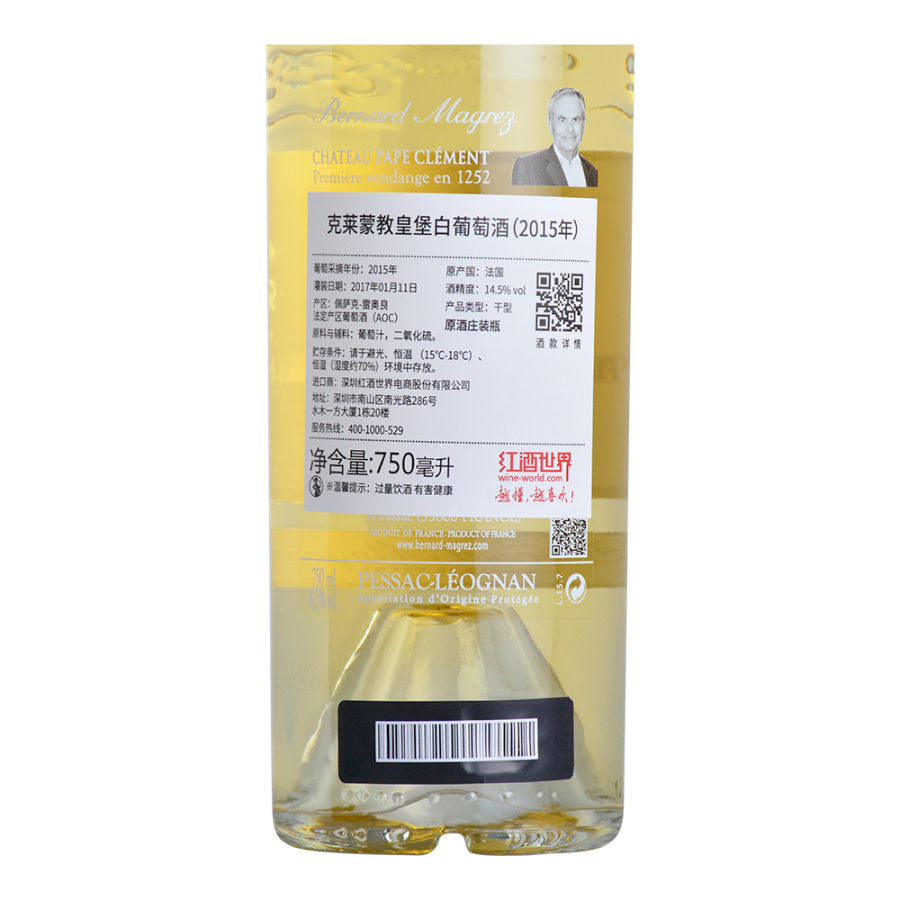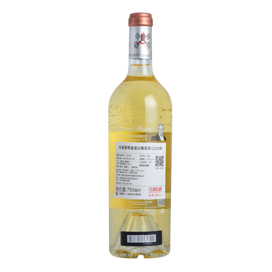 克莱蒙教皇堡位于法国波尔多格拉夫的佩萨克-雷奥良产区,酒庄历史悠久,发展至今已有700多年历史。得益于酒庄细致严谨的酿酒工序,克莱蒙教皇堡白葡被《费加罗报》(Le Figaro)认为是佩萨克-雷奥良和波尔多最佳的干白葡萄酒之一。2015年份的此酒散发出柠檬、梨、白桃和酸橙的香气,酒体饱满,口感清新,酸度爽脆,富有活力,余味美妙,萦绕着柑橘和甜瓜的味道,颇具力量感和深度。