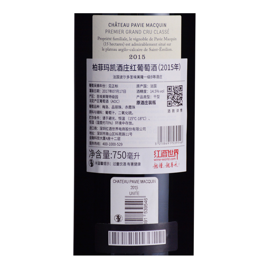 这是一款来自法国波尔多(Bordeaux)产区的红葡萄酒,是圣埃美隆一级B等酒庄——柏菲玛凯酒庄的正牌酒。2015年,柏菲玛凯酒庄的采收日期从9月29日持续到10月17日。酒庄的正牌酒在经过发酵之后,通常会在新桶比例为60%的法国橡木桶中熟成18个月左右。该酒呈深宝石红色,散发着花朵和波森莓的香气,伴有甘草、浓缩咖啡豆和樱花的气息,口感纯净柔顺,带有明显的矿物质风味,其果味新鲜纯净,余味悠长且富有深度。