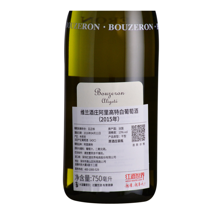 这是一款来自法国勃艮第夏隆内丘(Cote Chalonnaise)产区的白葡萄酒,由维兰酒庄出品。该酒选用布宏哲村(Bouzeron)出产的阿里高特葡萄酿制,该村是勃艮第地区唯一使用这种阿里高特酿酒的村庄级法定产区。2015年份的这款酒口感清新,散发着柠檬、青苹果和蜂蜜的香气,带有一丝果馅饼和矿物风味,口感丰富,十分美妙。