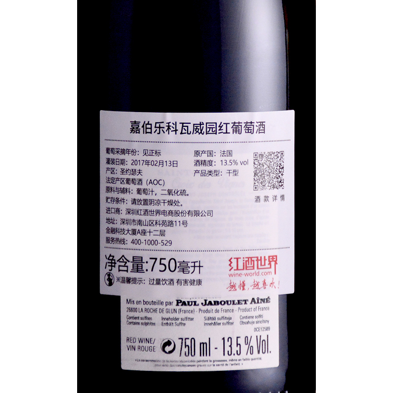 这是一款来自法国罗讷河谷(Rhone Valley)产区的红葡萄酒,产自著名的嘉伯乐酒庄(Domaine Paul Jaboulet Aine)。这款酒酒体中等至饱满,带有浓郁的黑色水果和蓝色水果的风味,散发着馥郁的矿物气息和香料的香气,入口后,烟熏的草莓交织着樱桃利口酒和五香粉的风味使得这款酒更加活泼,单宁耐嚼,纹理细腻,余味悠长,陈年潜力较好。
