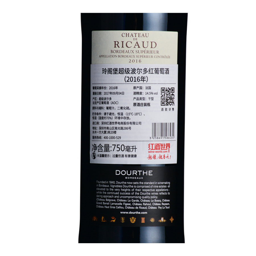 玲阁堡是杜夫(Dourthe)集团旗下酒庄之一,出产着多款优质的波尔多美酒。2016年玲阁堡超级波尔多红葡萄酒呈诱人的深宝石红色,香气馥郁,散发着新鲜的草莓等红色莓果以及黑樱桃的芬芳,口感柔顺而圆润,在清新的果味中保持着美妙的平衡,余韵悠长,是一款十分迷人的葡萄酒。