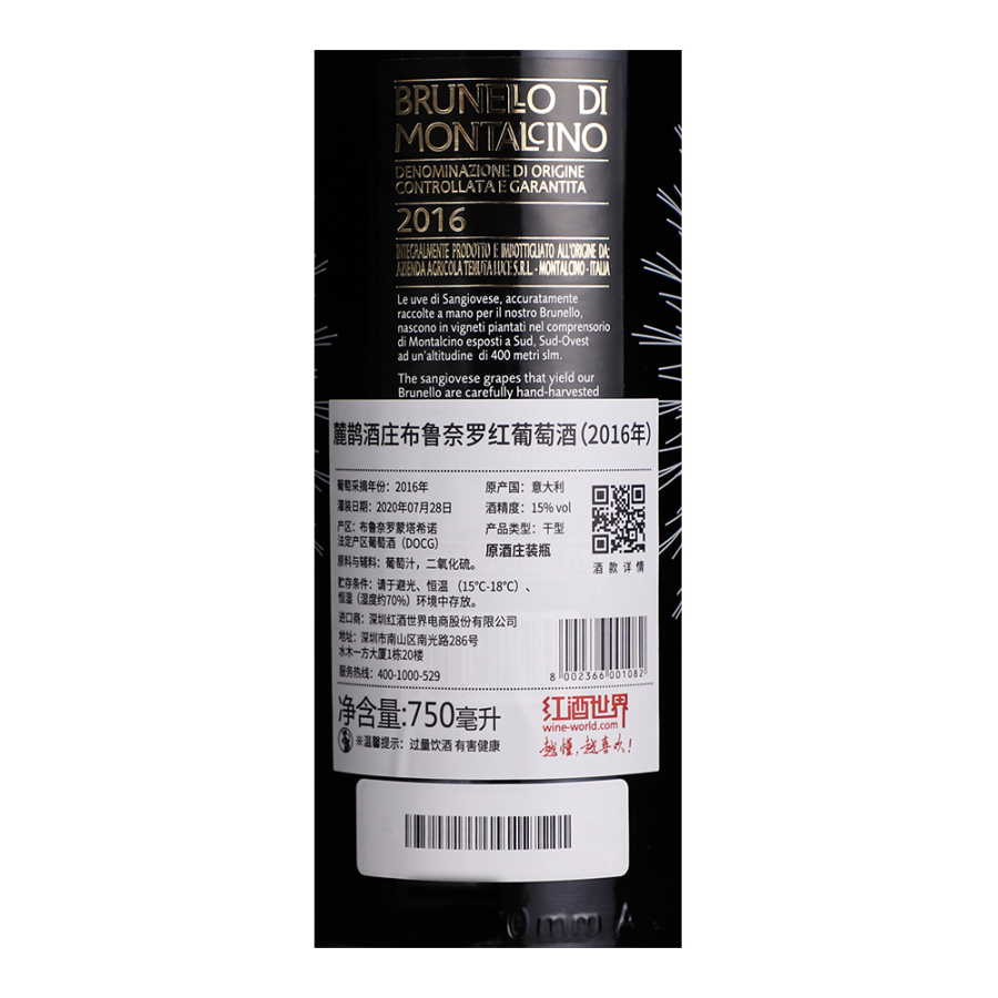 2016年麓鹊酒庄布鲁奈罗红葡萄酒