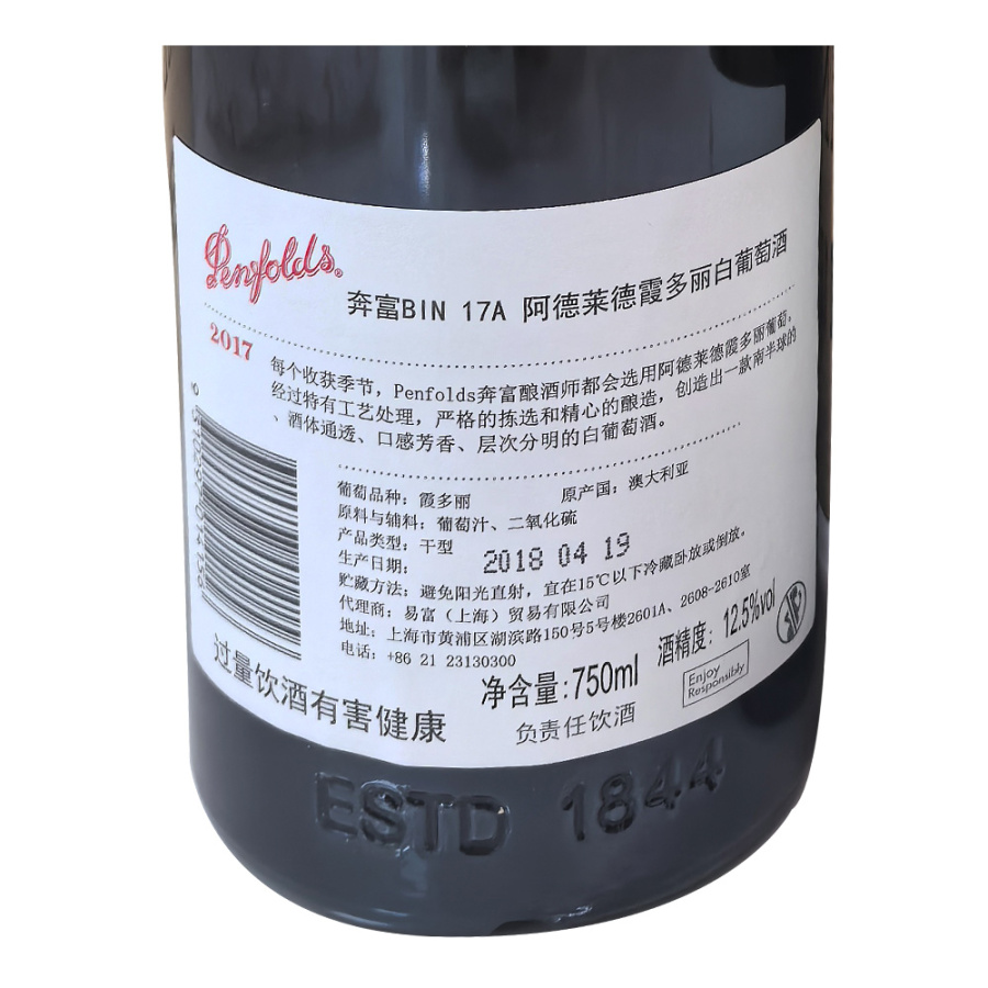 2017年奔富BIN17A阿德莱德霞多丽白葡萄酒