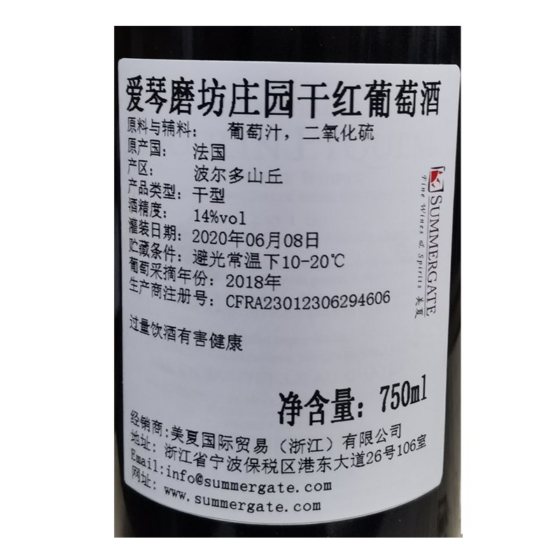 2018年爱琴磨坊庄园干红葡萄酒 布尔丘 波尔多红葡萄混酿 品质服务 品质服务