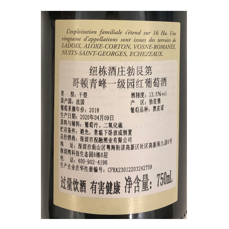2018年纽栋酒庄勃艮第哥顿青峰一级园红葡萄酒