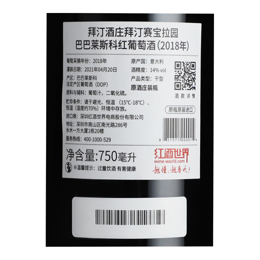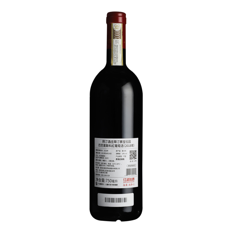 2018年拜汀酒庄拜汀赛宝拉园巴巴莱斯科红葡萄酒