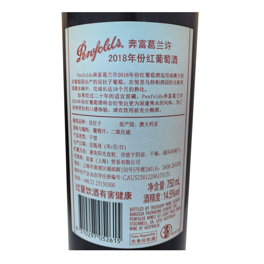 2018年奔富葛兰许红葡萄酒 奔富酒庄 南澳洲 设拉子 赤霞珠2 品质服务 品质服务