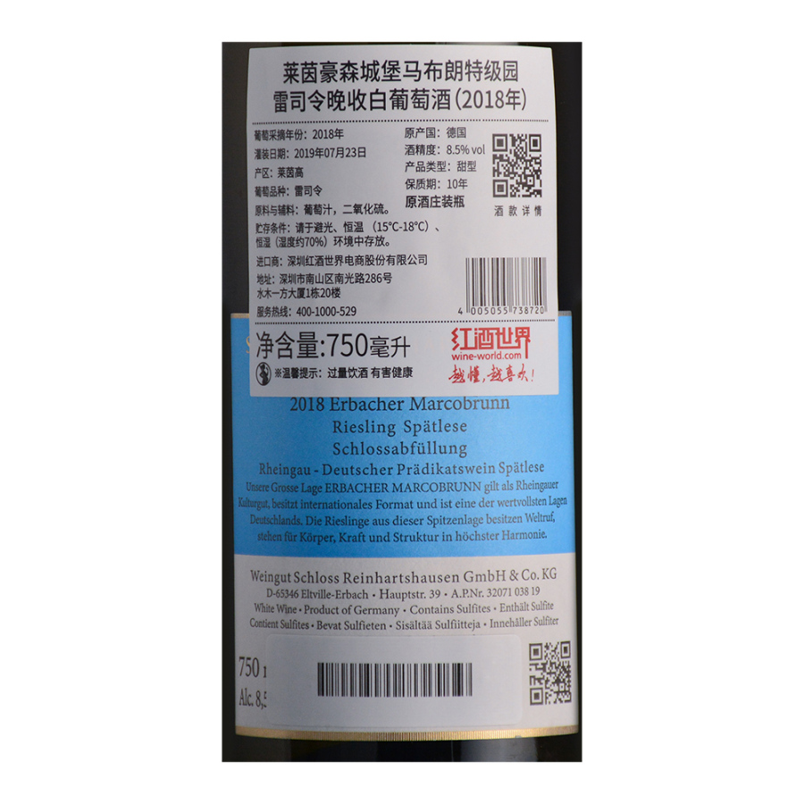 2018年莱茵豪森城堡马布朗特级园雷司令晚收白葡萄酒