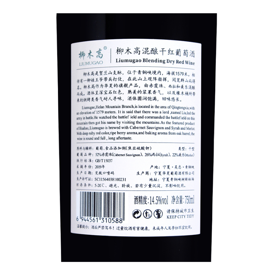 2019年华昊酒庄柳木高混酿干红葡萄酒