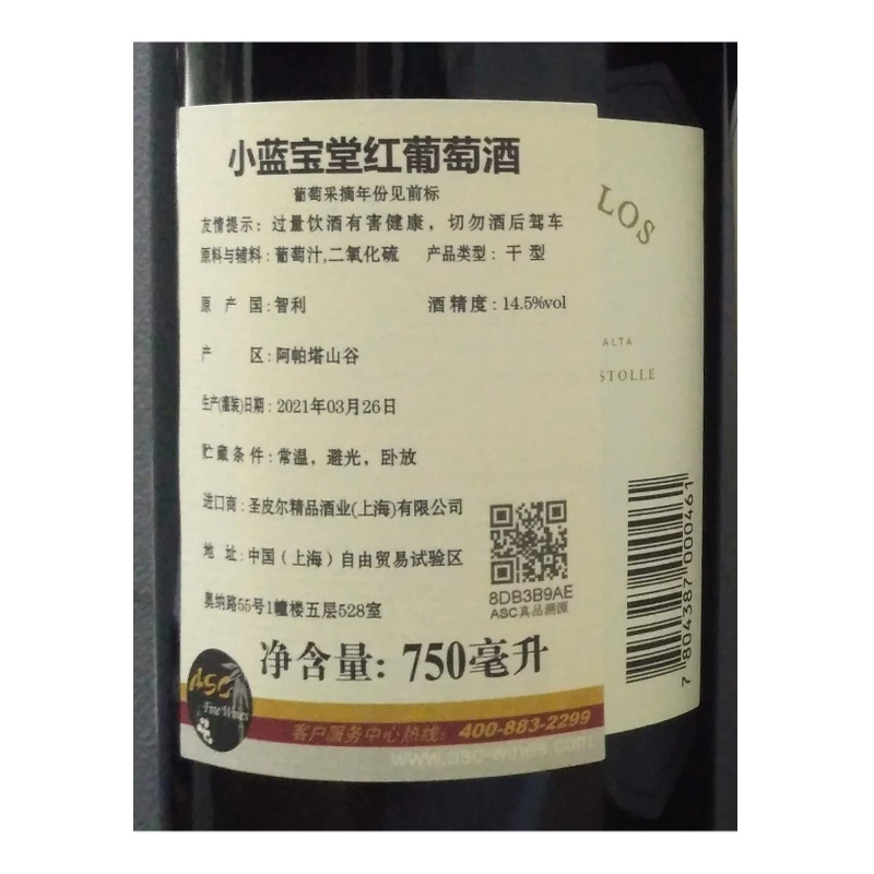 2019年小蓝宝堂红葡萄酒 空加瓜谷 佳美娜 赤霞珠2 梅洛2 味而多2 品质服务 品质服务