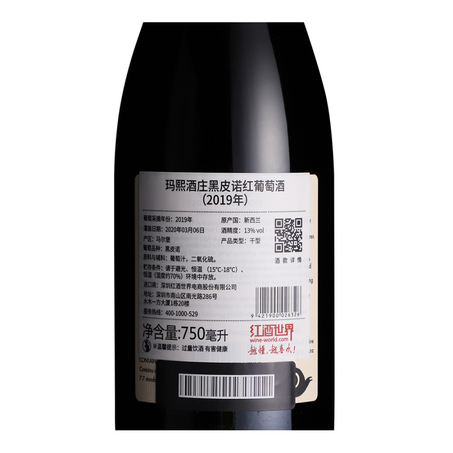 这是一款来自新西兰马尔堡产区的红葡萄酒,产自玛熙酒庄。2019年降雨量偏少,产出的酿酒果实颗粒较小但品质优异。该年也是酒庄最早开始采收期的一年。酿酒葡萄来自3个不同的葡萄园,经去梗后进行冷浸渍,30%的葡萄与葡萄梗一同发酵,或者采用天然酵母进行整串发酵,而后酒液在法国橡木桶中陈酿10个月。2019年玛熙酒庄黑皮诺红葡萄酒香气浓郁而复杂,散发着红色水果和黑色水果的甜美芬芳。其口感醇厚、成熟而饱满,充盈着黑樱桃和李子的味道,单宁柔顺,余味圆润。