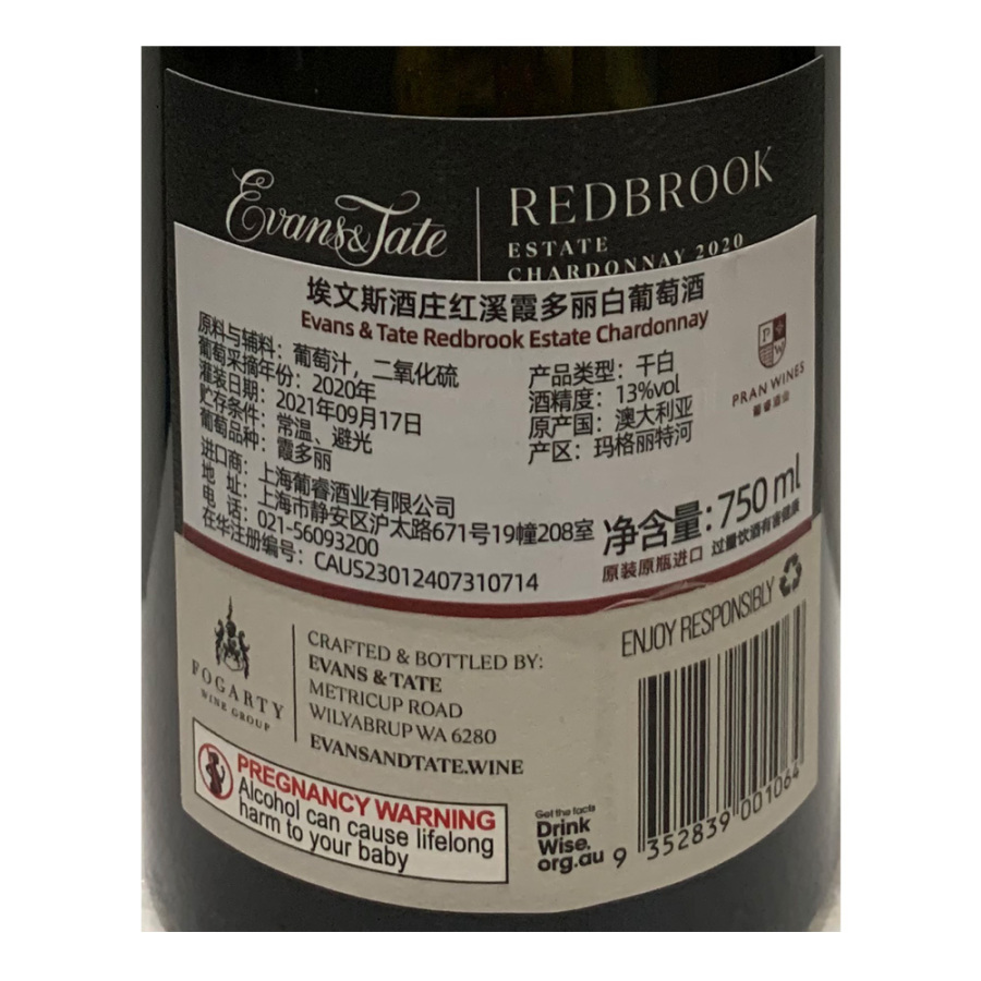 2020年埃文斯酒庄红溪霞多丽白葡萄酒
