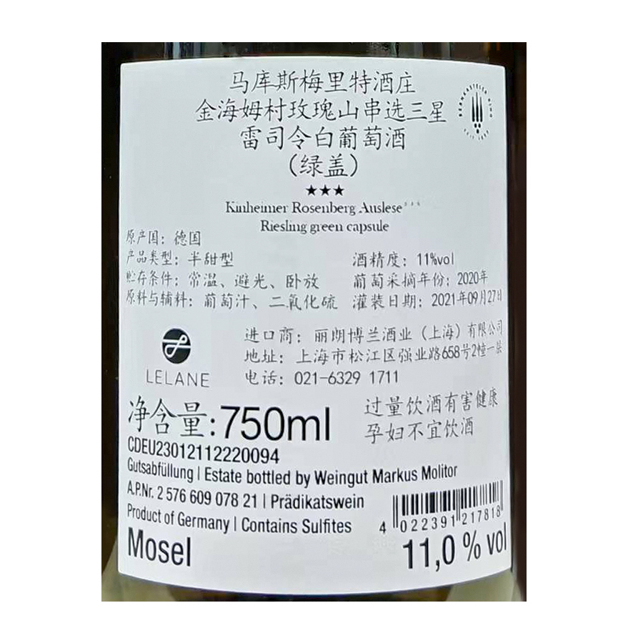 2020年马库斯梅里特酒庄金海姆村玫瑰山串选三星雷司令白葡萄酒(绿盖)
