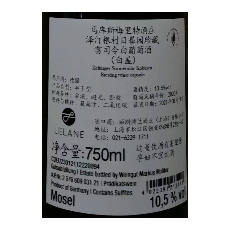 2020年马库斯梅里特酒庄泽汀根村日晷园珍藏雷司令白葡萄酒(白盖) 玛斯莫丽酒庄 摩泽尔 雷司令 品质服务 品质服务