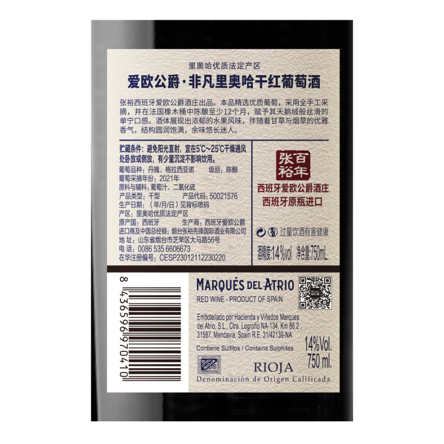 爱欧公爵酒庄地处西班牙知名的里奥哈产区,由李威罗(Rivero)家族于1899年创建,目前是张裕旗下的海外名庄之一。2021年的这款酒在法国橡木桶中陈酿了至少12个月,成酒果香浓郁,伴随着甘草和烟草的典雅气息,质地圆润饱满,单宁柔顺丝滑,余韵绵长怡人。