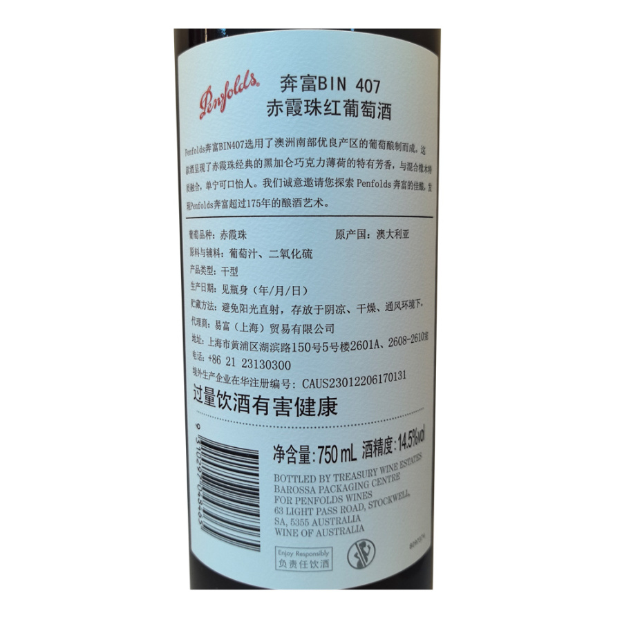 推荐奔富酒庄看做是澳大利亚葡萄酒的象征,被称为澳大利亚葡萄酒业的贵族;Bin407是奔富旗下的中高端酒款,是Bin系列核心品质的代表佳作,被广大爱好者称为“教科书般赤霞珠”、“平替版Bin707”;弥漫着黑巧克力、莓果干、黑醋栗、薄荷、甘草和黑橄榄酱的芳香,口感醇厚饱满,质地丰盈顺滑,架构宏大。