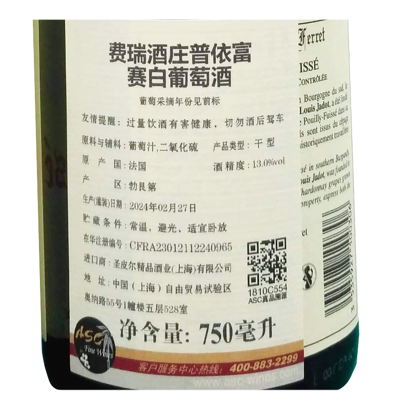 2022年费瑞酒庄普依富赛白葡萄酒