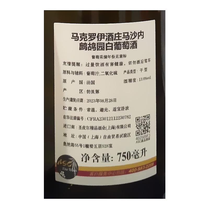 2022年马克罗伊酒庄马沙内鹧鸪园白葡萄酒