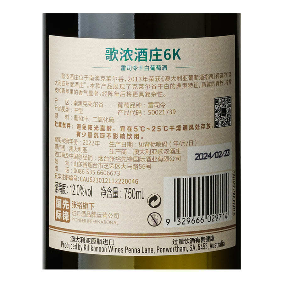 2022年歌浓酒庄雷司令干白葡萄酒(6K) 歌浓酒庄 克莱尔谷产区 雷司令 品质服务 品质服务