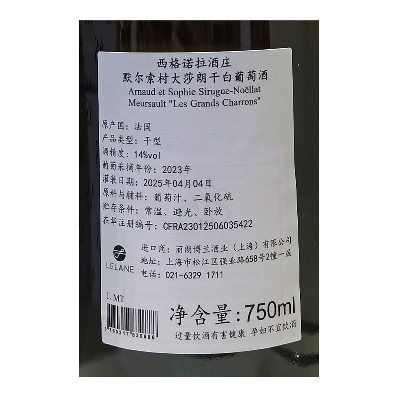 2023年西格诺拉酒庄默尔索村大莎朗干白葡萄酒