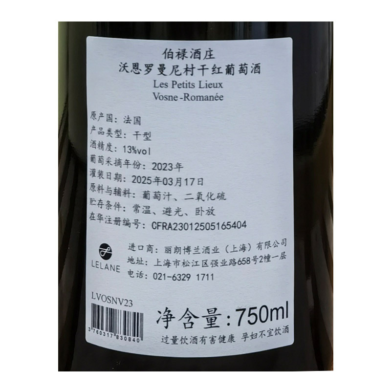 2023年伯禄酒庄沃恩罗曼尼村干红葡萄酒
