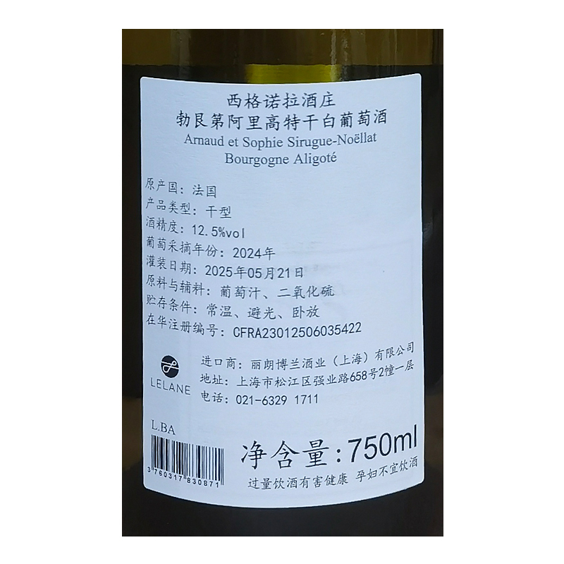 2024年西格诺拉酒庄勃艮第阿里高特干白葡萄酒