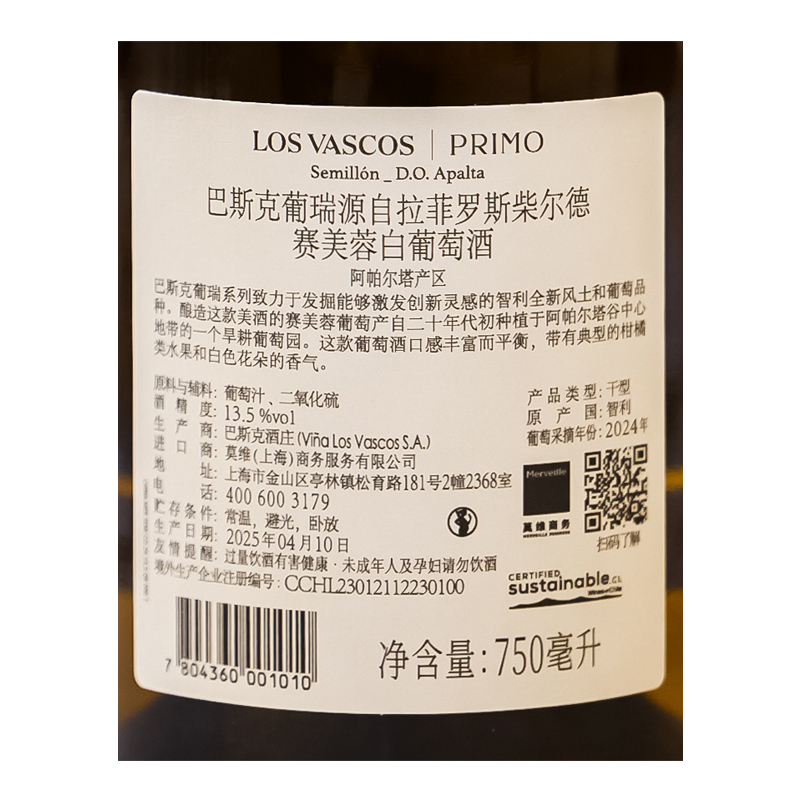 巴斯克酒庄坐落于智利的空加瓜谷产区,其悠久历史可追溯至18世纪,如今归属于拉菲罗斯柴尔德集团旗下,扎根智利优渥风土,出品一系列个性鲜明的出色酒款。2024年的这款酒色泽金黄,绿色光晕点缀其上,香气表现力丰富——柑橘、白肉水果和杏的芳香此起彼伏,伴随着苹果派和焦糖布丁的怡人甜香,一丝蜂蜜和燧石气息潜藏其中,口感架构宏大,层次丰富,酸度明快,张力十足,余韵经久不散。