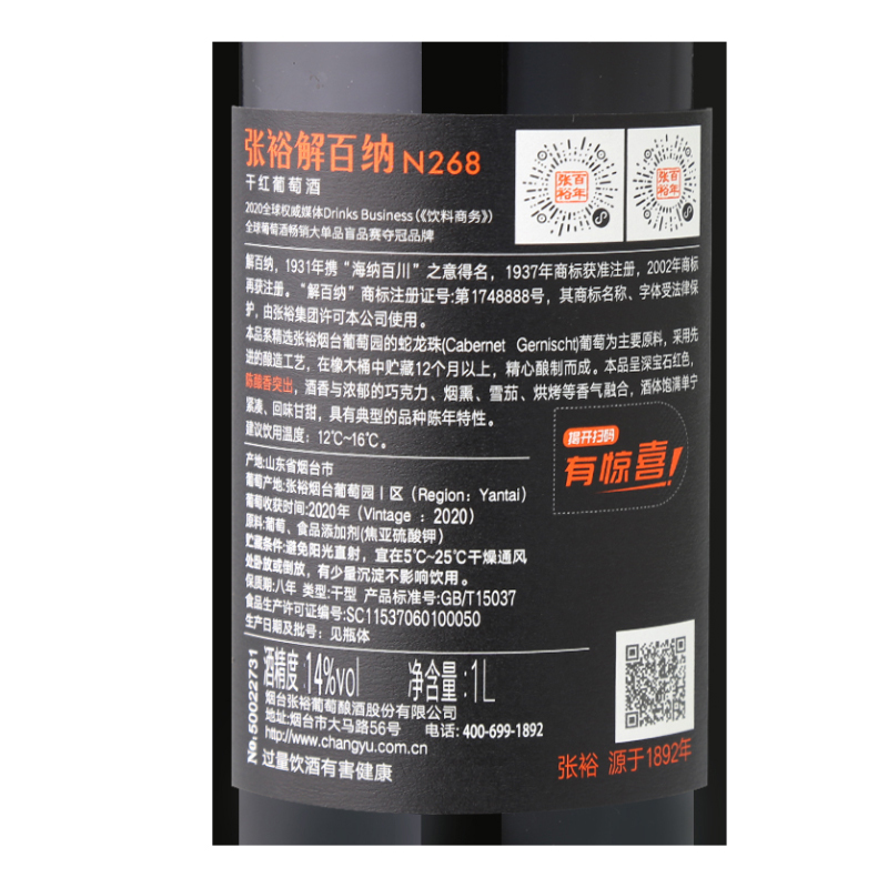 张裕解百纳N268干红葡萄酒