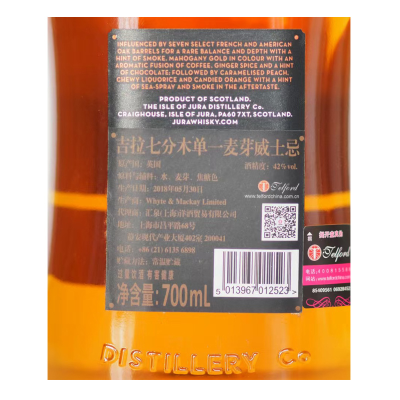 吉拉(Jura)坐落于苏格兰西海岸的偏远小岛——吉拉岛(Isle of Jura)。小岛西北部的海域漩涡湍急,正因如此,吉拉设计了造型独特的阔肩圆身酒瓶,希望护佑瓶中的威士忌平安穿越这片危险重重的海域,顺利运达世界各地。酿造过程中,此款威士忌的原酒先在波本桶陈年,而后将部分酒液分成6份,分别在6种来自法国不同产区的新橡木桶中陈酿,其名“七分木”正是由此而来。这款酒呈金黄色,咖啡、生姜、香料和巧克力的芳香飘然而出,焦糖奶油、烤桃子、甘草和糖渍橙子的味道此起彼伏,层次鲜明,复杂度出众。