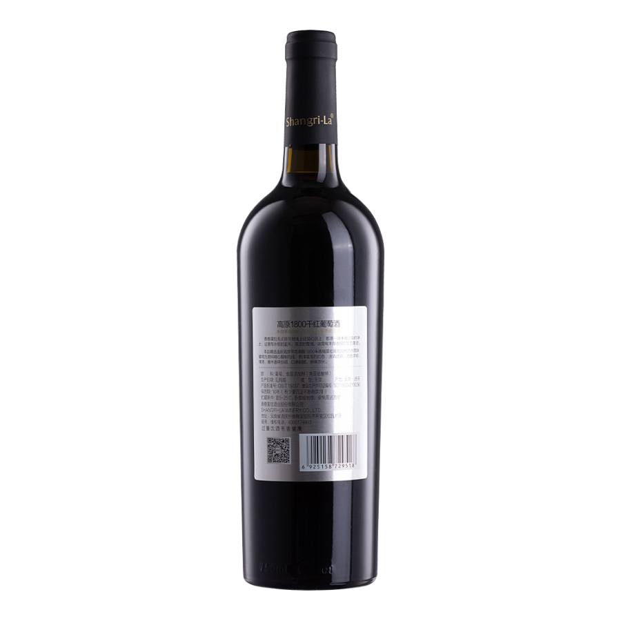 香格里拉酒业于2000年初在云南迪庆香格里拉成立,在藏语中,“香格里拉”意为“心中的日月”,是永恒、圣洁与神秘的象征。香格里拉海拔1800高原干红葡萄酒采用赤霞珠酿造而成,酿酒葡萄来自迪庆高原平均海拔1,800米的葡萄园。该酒酒液呈清澈透亮的宝石红色,香气浓郁,水果芳香与橡木气息相互协调,质感细腻,余味悠长。